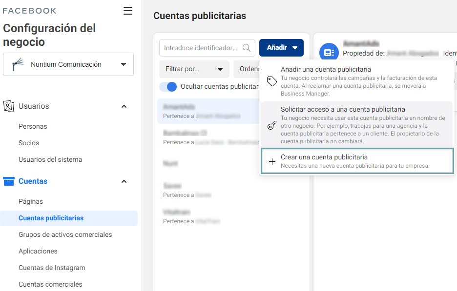 Una vez hagas clic en ‘Configuración del Negocio’ tendrás un listado en el menú izquierdo del panel en el que encontrarás el apartado ‘Cuentas’ y, dentro de este apartado, ‘Cuentas Publicitarias’. Es entonces cuando podrás hacer clic al botón de ‘añadir’ y te aparecerán tres opciones: